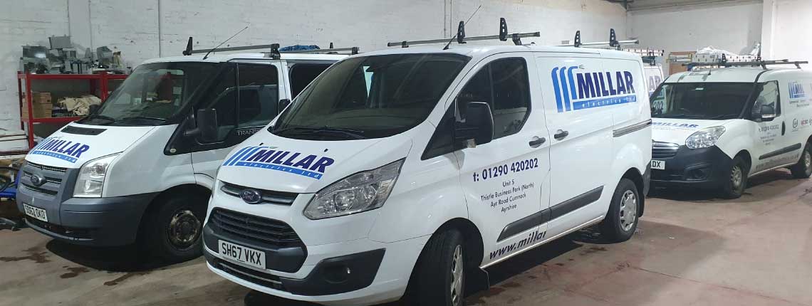 A wide range of electrical works are carried out for domestic, commercial and industrial clients. Offering the required electrical services to a large and varied customer base, Millar Electrics treats every job importantly, professionally and at competitive rates. We are within 30 minutes drive of all parts of Ayrshire, and less than 1 hour from Glasgow.
